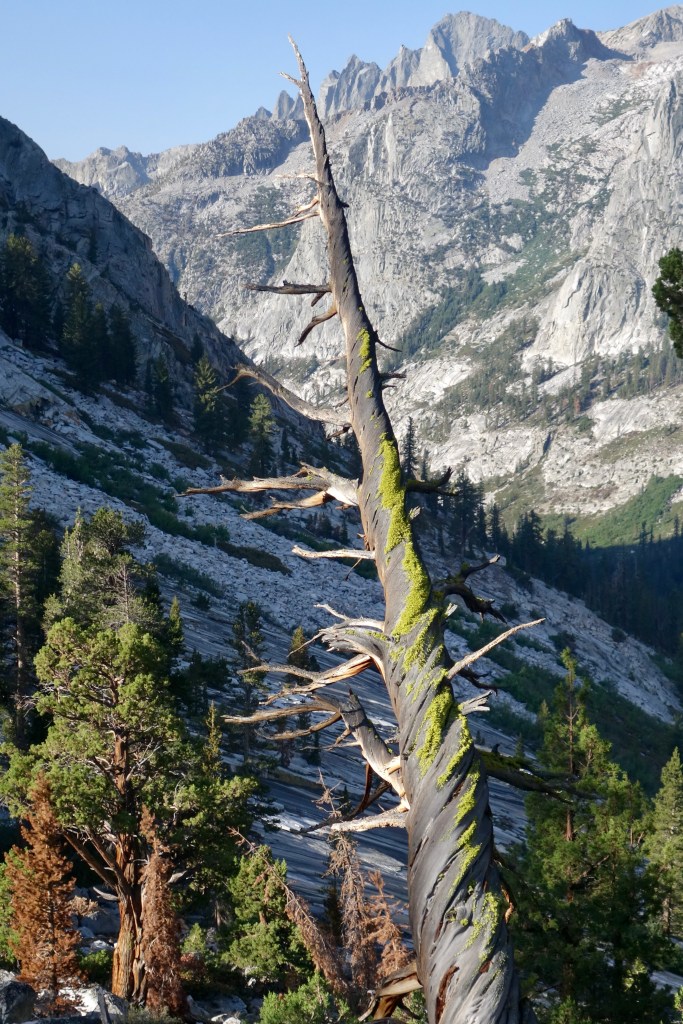 We hung a left turn across a fallen tree at the first junction, leaving the JMT just in time to avoid a huge group of camping hikers. Then up a veritable ladder of switchbacks, mercifully still draped in shade. The climb was relentless, yet we cruised. Spice pointed out that some of the larger steps that might have slowed her down a week ago, now glided by underfoot like a mellow speed bump. Yep, we were feeling strong. We were strong, and with just few snacks left to eat, our packs felt more like helium balloons than cumbersome burdens. The trail zigzagged between some magnificent juniper trees, some that I could remember from a trip in 2006. Their orangutan-orange, fuzzy bark burned like lava once the sun climbed high enough to light them up.
