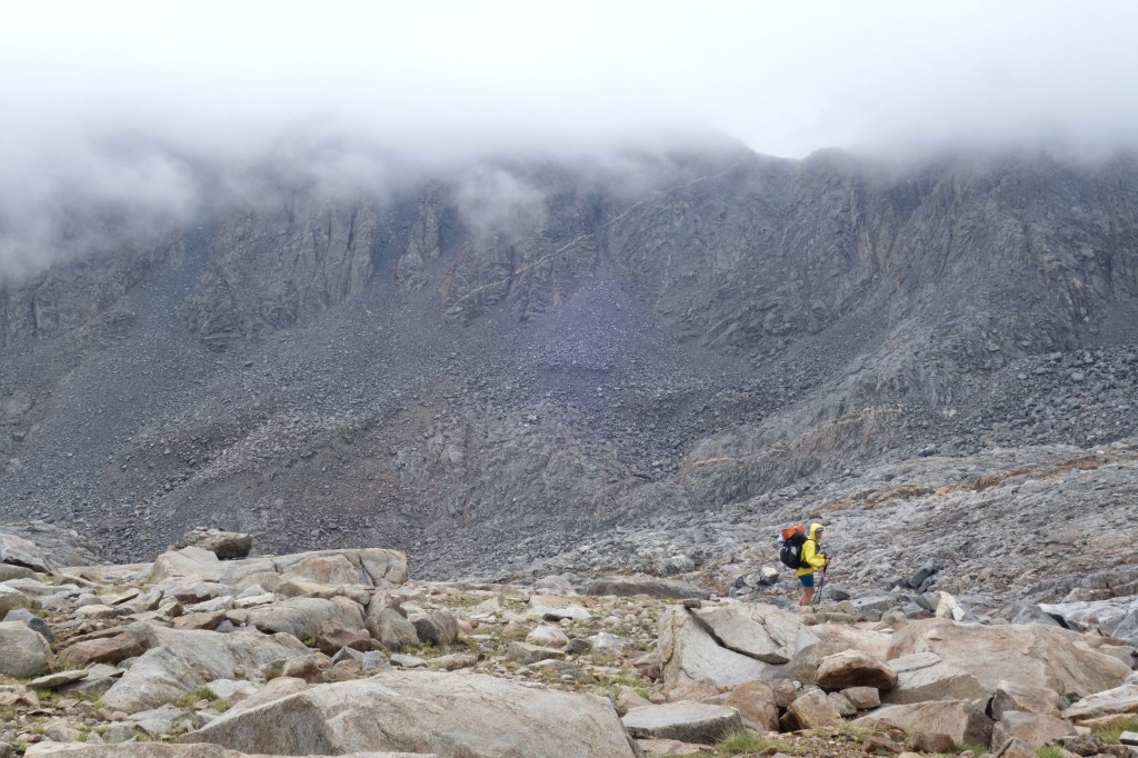 By the time we had made it the six miles back to Bishop Pass, the weather was improving. We turned off the trail, pointing generally south towards the not-yet-visible Thunderbolt Col, around the foot of Mount Aggassiz. The lichen-covered rocks were slick with the stored moisture, but the unblemished stones were already dry. Hopping on talus and unstable scree was ponderous work with such heavy packs, but we made steady progress.