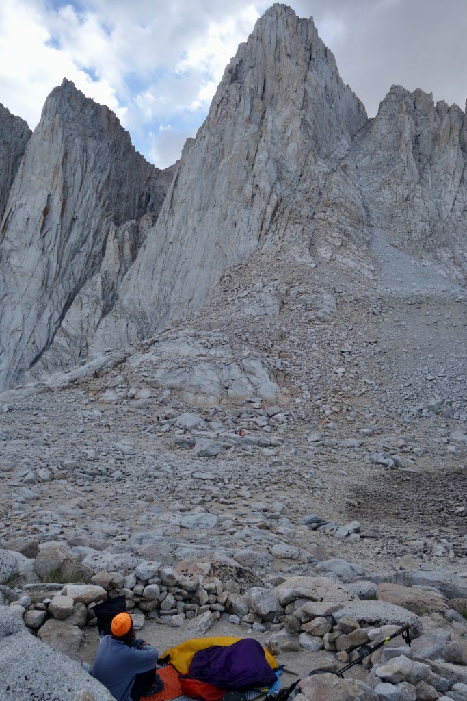 A sandy flat transitioned to a steep ramp of sand, which we followed, skiing and stumbling well-over 1,500ft down to Upper Boy Scout Lake. After a brief rest to empty our shoes and filter water, we began the final climb of the day up towards home at Iceberg Lake. A good use trail was easy to follow up to the last barren flat at the base of the sheer east face of Mount Whitney. The lake was busy with climbing parties resting for another day of climbing tomorrow, but Spice and I found undoubtedly the best campsite there, above the lake with a view of everything. A low rock wall bounded a flat patch of sand. A large boulder formed the perfect backrest. We cooked up a double portion of beans and mac n cheese, then reclined to scrutinize our route for tomorrow, the Mountaineers Route.