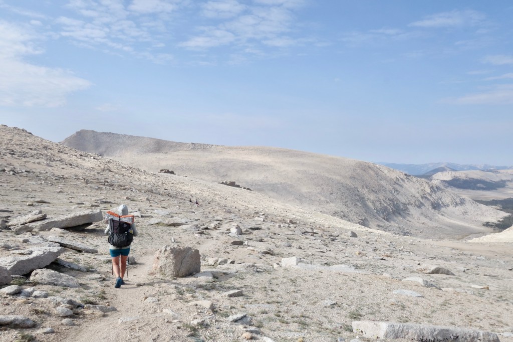 The air was cool and breezy after we left those fantastic foxtail behind. A sandy plain gradually steepened into a sandy slope, and we fell into a rhythm after stumbling upon a good trail. The conversation drifted towards the future and Spice’s new job that awaited her back at home. After an apartment building-like rock full of marmots, the long switchbacks gradually straightened as the sandy slope leveled out again. We were on top a big blob of granite sand looking ahead at other blobs of granite sand. Beyond them to the south, the horizon flattened to a hazy squiggle, not a prominent peak in sight.