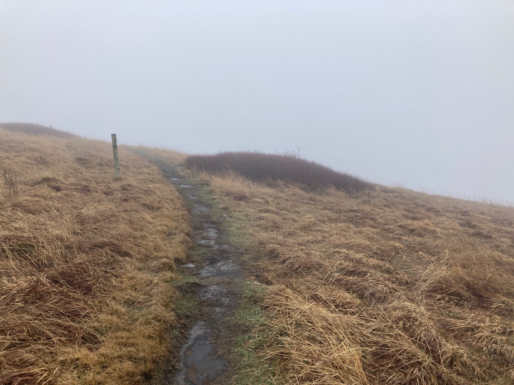 When I did reach the top on Big Bald, all I could do was read about the amazing views. The big grassy lump, like Max Patch a few days earlier, reminded me of the hills in Wales or England, moreso today because of the driving mist. I quickly became chilled on the exposed slopes, and boogied down the other side, following a good trail and wooden posts back into the sheltered forest.