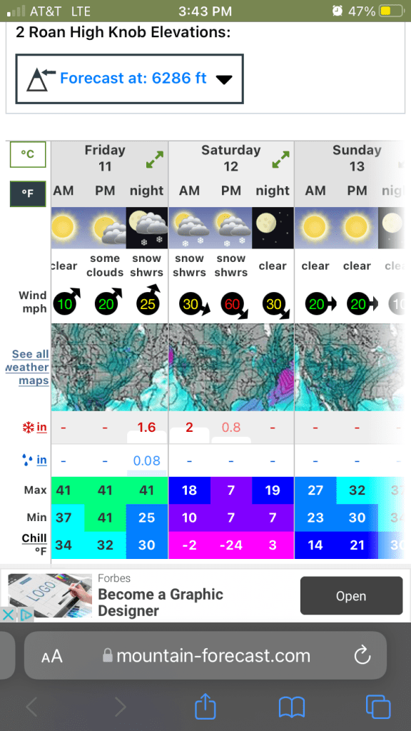 For once, the trail did not immediately climb up from this gap. Instead it cruised flat, and even trended a bit down for a couple good, warm-up miles. I stopped to chat with Lifeguard and Spoon, while petting their exuberant golden lab, Louie. They were cooking up breakfast on a log after warming up with a few miles of their own. After the usual introductions and getting acquainted, the conversation inevitably drifted to our strategies to survive the impending cold-snap. While checking the weather last night in my tent, I was shocked to see the eye-popping numbers coming to the area on Saturday. We’re talking snow and near-zero temperatures, not considering wind-chill. With the trail climbing back above 6000ft for the exposed ridges of the Roan Highlands, at risk was not just our comfort, but also our digits, maybe our lives. I had decided to spend two nights at the Greasy Creek Friendly, just a half-mile from trail at the start of the high walking. The others had found dog-friendly accomodation in Erwin. An unplanned zero day was not ideal, but it was better than dying.