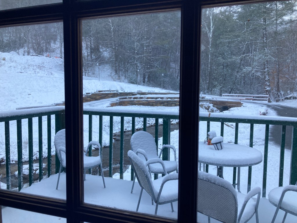 I awoke to a few inches of snow on the porch furniture outside the large glass door, one bunk away. The snow was still coming down in thick sheets, snow globe style. Apparently I had slept through a tremendous deluge of rain in the wee hours of the morning, but the scene was relatively peaceful now. The occasional gust of wind ripped through the small valley, shaking the whole building.