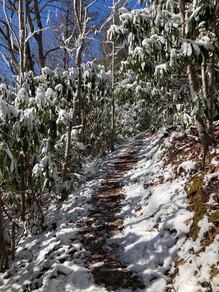 Aside from a few chances to look back at the Roan Highlands from the occasional meadow, my view was limited to a tunnel of snowy rhododendron. It bowed under the weight of the snow still clinging to the drooping leaves. The intermittent thuds from falling clumps sounded like footsteps or the click of a trekking pole, which had me constantly turning to see who was gaining on me. No one. I had the footprints to follow, but I was alone.