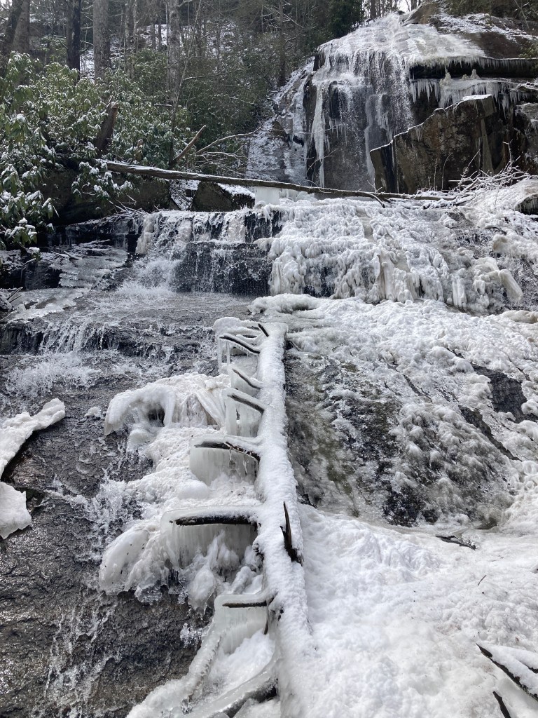 Jones Falls was a worthy detour to see the ice-coated logs and massive sheets of icicles hanging from a cliff. After that, I kept my head down, both to find solid footing and keep it away from the low branches. The trail squiggled around hillsides, crossing a rushing creek on a small log bridge at each crevice and corner. The hiking was easy, and I cruised.