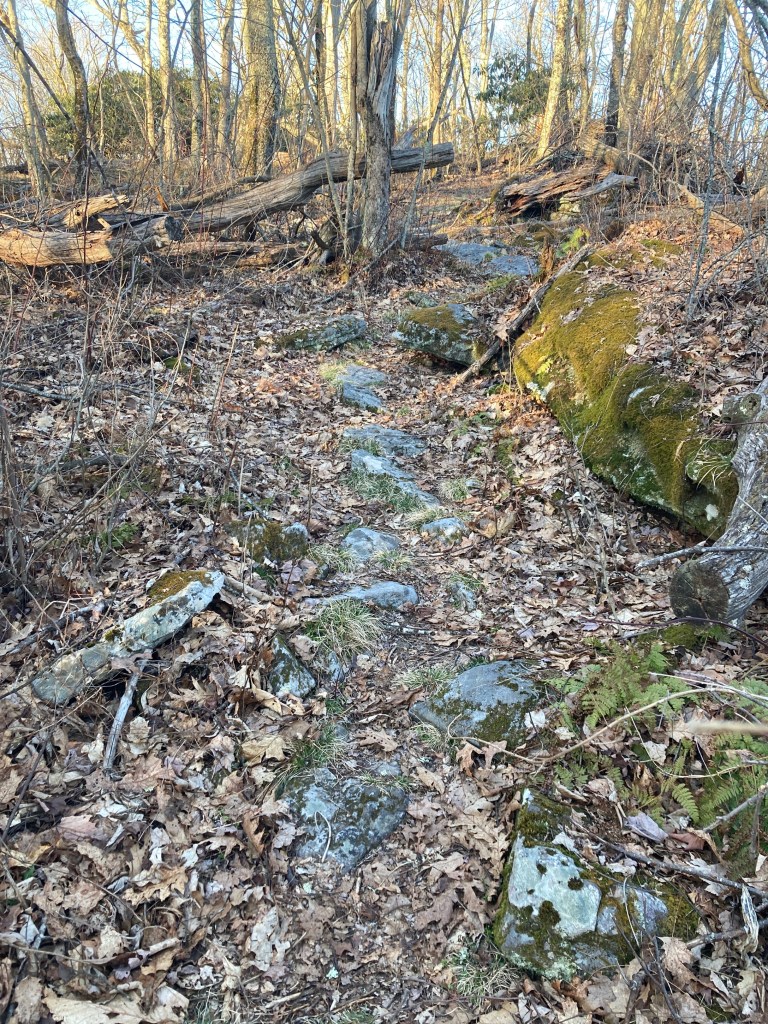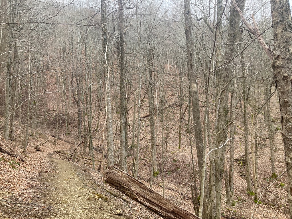 I found shelter from the wind and a comfortable temperature as I followed the trail up through a classic forest of oak and beech. A bird somewhere mimicked with startling accuracy the sound of an old seesaw, or rusty swing set blowing in the breeze. It was the kind of sound effect used in a horror movie and contributed to a strange vibe. I ate my fig newtons and brownie things, pulled from my shorts’ pockets, without stopping.