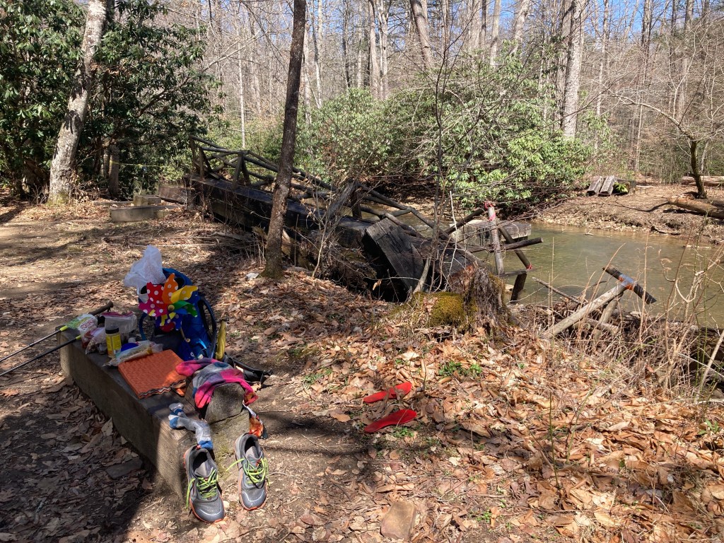 The clouds started breaking up as climbed up and over yet another ridgeline. Even though I was hungry, I pushed a little past my lunchtime in order to give the sun a little extra time to warm things up and to get the fording of Lick Creek out of the way. The notes in my app warned of a knee-deep crossing or worse in times of high water, but my shins stayed dry as I churned across the gentle flow. I planted on a piece of the old bridge for lunch, taking the opportunity to wash two pairs of socks to combat the unsustainable growth of crustiness and odor. After hanging them to dry and tipping my shoes so that they could drain, I munched on lunch while trying to imagine the force of water that had lifted the formidable bridge that now lay tipped on its side, discarded along the river bank like a dented up beer can. The water must have been flowing serveral feet higher and well wide of its banks. An awesome, terrifying scene, I’m sure.