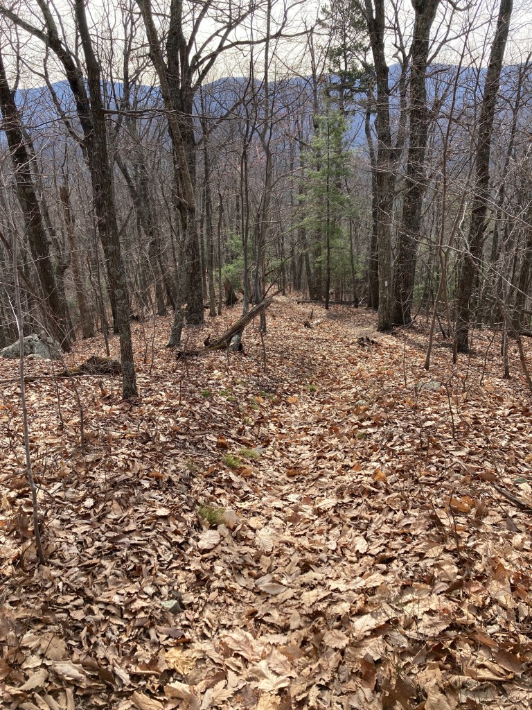The climb was long, though smooth and agreeable. I got a kick out of a patch of miniature pine trees scattered amongst massive oak. It was a funny contrast and I wondered if and when the roles might be reversed in the future. I had a good chat with some flip-flop hikers heading the other way who agreed that the wind had sucked (see, it wasn’t just me), then was suddenly at the top, and over it. Minor views through the trees gave me context for me efforts, showing me that I was now higher than most things, but there were no sweeping vistas. I took a swig of slushy water, and moved on.