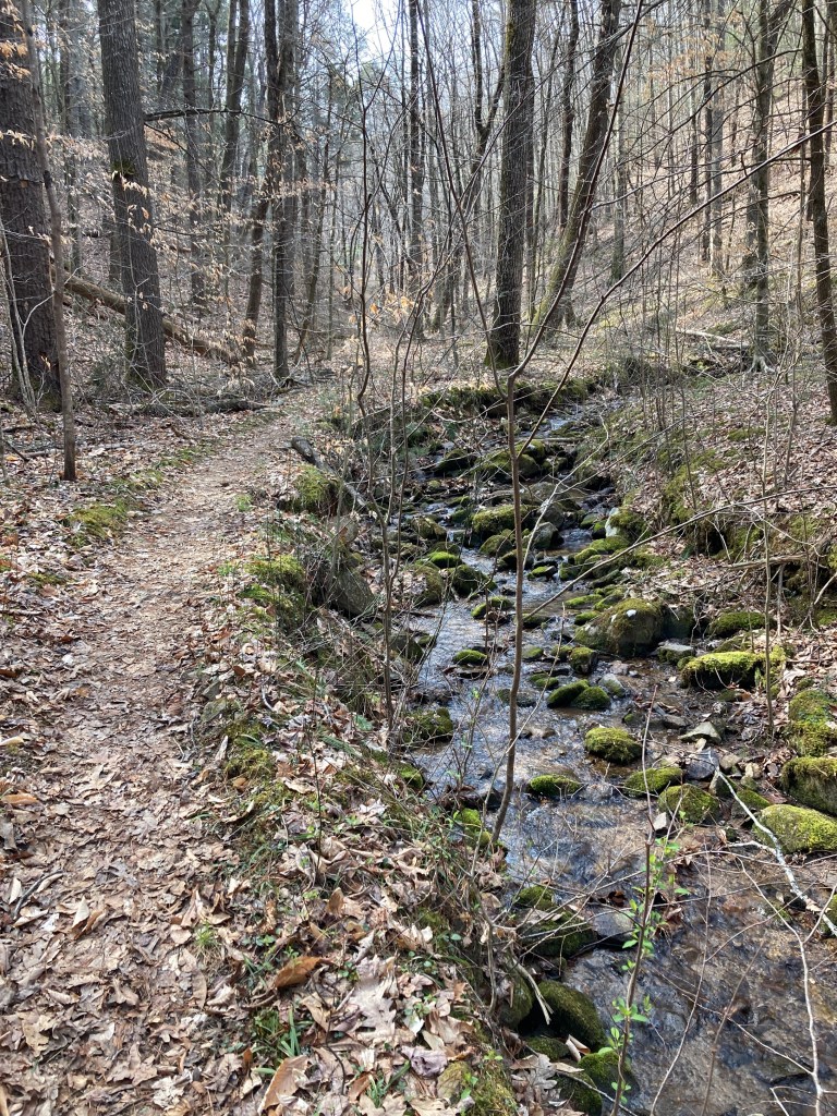 At the bottom, I crossed the Blue Ridge Parkway again, then began a gentle climb up and over a minor hill. The uphill was warming and I was grateful for the chance to generate some heat. With the sun out of commission for the time being, I needed to do it myself. The trail flowed down again on easy switchbacks in a lovely forest of towering, widely spaced oak and pine. I crossed a few tiny creeks and wandered around contours, all sense of direction and context for where I was going lost under the sparse canopy. The trail knew where I wanted to go, and I let it take me there. I dipped repeatedly into my pockets for small breakfast morsels. With some new things on the menu, I enjoyed the excitement of opening more, smaller bars, but felt dismay as the empty wrappers piled in my hip belt pocket. I passed a huge shelter, big enough to sleep 20, empty for now, then filtered water for the big climb of the day. I removed my fleece, and got moving to preserve my comfort.