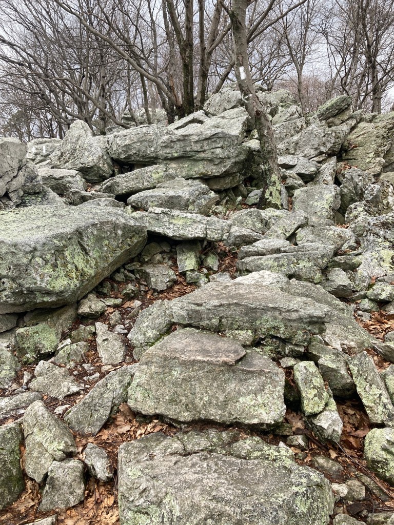 A mile later, I took the short side trail to The Pinnacle, a cliffy viewpoint, not unlike Tinker Cliffs. I wasn’t quite ready to stop for lunch, but the place was perfect, so I planted my butt on a stone chair and popped off my shoes. Puffy gray clouds, some trailing showers of snow blew across the expansive valley below. The sound of a truck, here and there, grumbled up from the country roads that meandered across the quilted patchwork of green pastures and bright farmhouses. A vulture rode the wind blowing up the cliff at my feet. My gaze followed the straight ridgeline to my left, tracing the AT maybe to the end of Pennsylvania, many miles distant. I ate a lot of things, dragged on a crusty change of socks, laced my kicks, and got hiking after about an hour. Despite being warned that it was a popular day hiking destination, I’d had it all to myself. A perk of the mercurial weather.