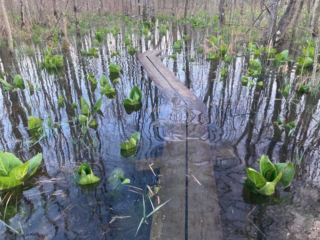 As nice as that was, my favorite moment of the day was still to come. After filling up my bottles at an unofficial, privately maintained shelter, the trail dipped into a boggy section of the valley. A quarter mile of boardwalk, that I’m sure usually sits above the mire, was mostly submerged under tannin-stained water. They bobbed and shuffled as I carefully picked my way along the watery trail. A fall here would have been a soggy, full-body affair. The water was a few feet deep, the mud below a bottomless ooze. Once I found my balance, it was fun, and I kept thinking that I was playing real-life Donkey Kong. Images of a monkey jumping from barrel to barrel played in the back of my mind. I made it across without drama, pleased with my balance and owner of spiffy clean shoes. Unfortunately, a patch of ankle deep mud immediately ruined that feeling, and I sloshed the last mile to camp feeling the extra weight with each step.