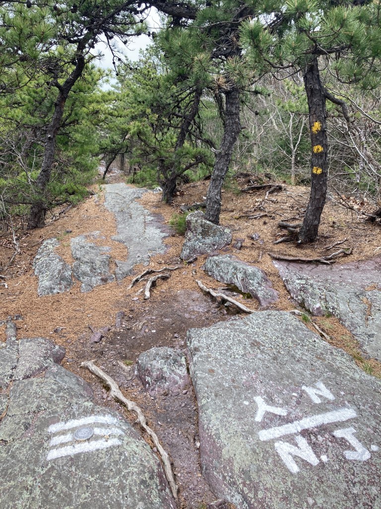 No matter, I was in New Jersey now, soon to be in New York. I crushed hard, up and over many rollercoastering rises and troughs, around big humps of granite, letting my legs find their natural stride, rather than micromanaging every step with care. The oak transitioned to pine, then I climbed up a short cliff. One hundred yards along a fin of stone and I was there. Painted on the ground was a short line, “N.J.” on my side, “N.Y.” on the other. I looked ahead and around me. Yep, this was a different environment entirely, and it happened in a blink. The pine trees whispered in the occasional gusts of wind. Around me, all I could see where hills and treetops. I knew that I was still only in New York, but the vibe was of somewhere much farther north, much more remote. Taylor Swift’s Welcome to New York welcomed me to New York, and I stepped across the line.