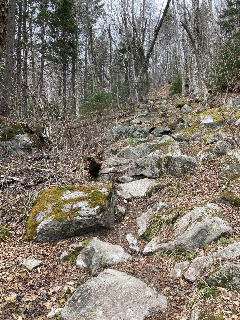 The privy was still screwed shut at Stratton Pond Shelter for some reason, but other than that, there wasn’t much to report. The trail was its typical mix of mud, boardwalks, brown leaves, twigs, branches, rocks, and downed trees. Come to think of it, this area had clearly been largely untouched so far this season. Aside from a few footprints squelched in the muck, the trail looked abandoned. Forest detritus was scattered everywhere, and it was not always obvious which direction I should turn. I needed to look hard for the subtle trough worn into the forest floor, or the roots polished bald by countless footfalls of rubbered soles. I did learn which mud puddles it was safe to walk across. Dry leaves on top meant dry feet. Wet leaves told me to hop on the rocks and branches across the deep ooze.
