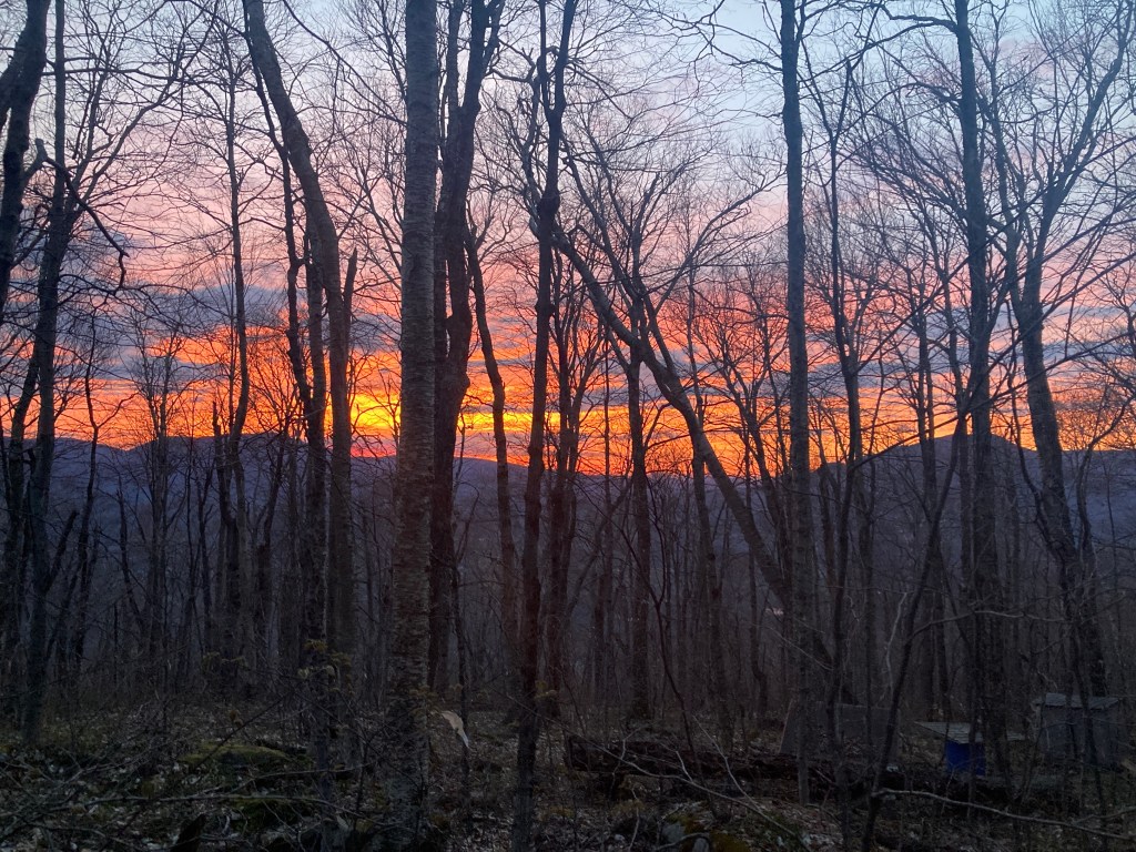 With flat trail, a mile of dirt road, and a gut full of farts that I couldn’t trust, I made great time, managing to make it all the way to Spruce Peak Shelter by 8pm. The last few miles were peaceful and nourishing as the evening light concentrated at the red horizon, which grew more intense through the bare trees. My favorite Trevor Hall jams complemented the vibe perfectly.