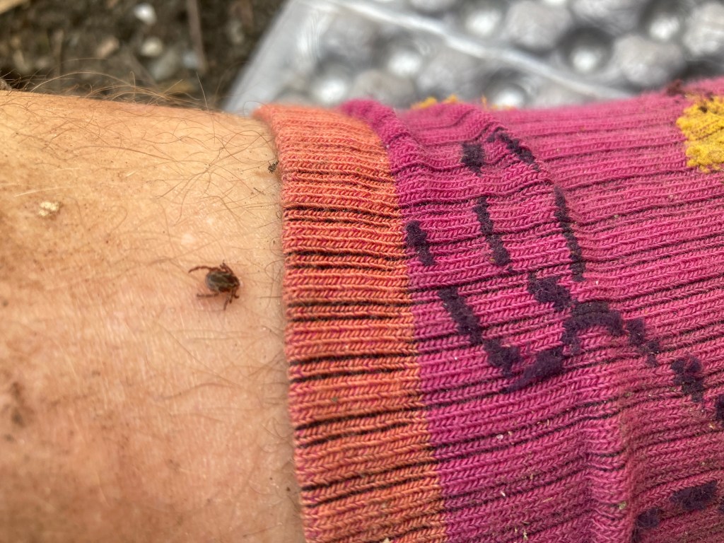 I plunked down in the dappled shade of a skinny oak between a Corolla and Tacoma. When I reached for my feet to unlace my shoes, I found a big ol’ tick, the first I’d noticed so far, squirming just above my sockline. Between my tights and long sleeves, I didn’t have much skin exposed at all, but this little vampire had found it. I used my Tick Key to lift it away, fascinated and unconcerned. This one at least would do me no harm. As an adult, it was easy to spot before any risk of Lyme transmission, but I did wonder about all the poppy seed-sized nymphs that were not so obvious. I vowed to check myself more carefully and more thoroughly in the future.