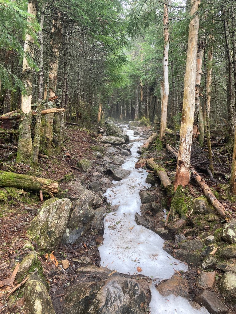 Immediately after leaving the summit, the rain blew back in, but I paid it no mind. I was recharged, feeling fine, and confident that it wouldn’t last long. Soon enough, it didn’t matter anyway, when the trail turned into a cascading waterfall for a few hundred feet. It wasn’t bad once I accepted the cold soaking, and I even pretended to enjoy it.