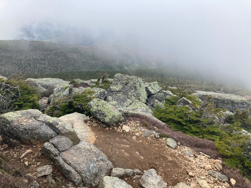 The rain did not last, but left a dripping forest that wetted me like a carwash, so when the trees disappeared around the summit of Little Haystack, I was not sad. The ridge was socked it, and cloud blew from the bottomless slope on the right across the narrow round of rock and dirt. My world was just a strip of ground, disappearing into the mist fifty yards ahead, and I loved it. Sure, I was missing out on what were surely epic views in all directions, but I was warm and comfortable. And besides, these conditions felt pretty epic too.
