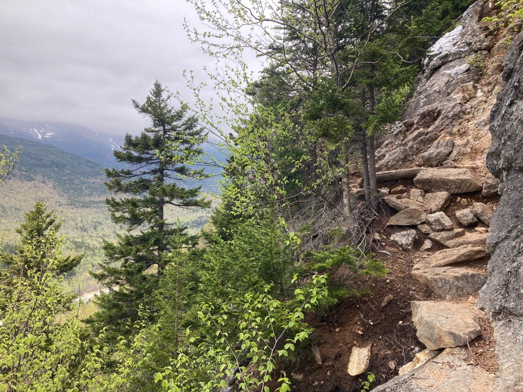 Before I knew it, I was back below treeline, where the challenging footing only got more difficult. The steepness remained, but the smoothness, wetness, and slipperyness of the footing all drastically increased. The payoff was less too, with no awesome views by which I could gauge my progress. Nope, for that I had to monitor the increasing fatigue in my quads, which rose steadily until I finally reached the trail junction at the Osgood Campsite. From there, it was not quite as easy as the flat elevation profile made it look to the Pinkham visitor center. Rocks, roots, and puddles kept reminding me that easy miles in these mountains are rare. Until I joined an old dirt road for the final mile and a half, at least. When I finally made it, I checked out the awesome 3D map of the Presidentials and filled my bottles with the most disgusting water I’d ever trusted enough to drink. Then I found Blackbird for a short visit with SpiceRack. We’d planned on meeting here for the night, but I was ahead of schedule and had plenty of bad-weather-food to get me to the next road, so I popped my head in for just long enough to satisfy my hug quota for the day and get down on some tomato and hummus toast that she made me. My stay was too short, and I walked away under spitting skies wishing that I hadn’t been so fast through the Presidentials, yet knowing that it had all worked out perfectly. I would have stayed for lunch at least, but with nasty weather impending, I wanted to make it up Wildcat Mountain before the “wintery mix” made the rocks super slick.