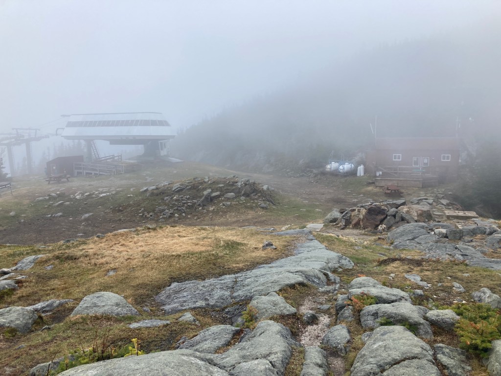 I was ravenous by the time I reached the top, and took shelter in the perfectly placed ski patrol cabin next to a superspeed quad-chair lift that looked like a spaceship in the mist. The heater was running and kept the chill at bay while I ate with abandon, throwing nuts, seeds, chips, fruit, and chocolate into my black hole of a stomach. Nothing seemed to satisfy me, though. My body was still desperately trying to build back after yesterday’s mammoth effort, and it gladly accepted everything I would provide. When three loud, but friendly bros showed up and offered me weed, I got out of there to brave the elements once more.