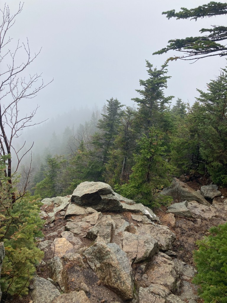 The climb up the first Wildcat subpeak was as steep as the rumors had led me to believe. The trail builders had done an admirable job of turning a veritable cliff into a ladder of a rock staircase, but years had eroded it so that some parts required all my arm strength to boost me up a waist-high step. Some other short sections required legitimate scrambling that made me glad that I was going up and not down. Meanwhile, the rain came in lightly, just enough to wet the rock, but not enough to make me put on a jacket. The cloud descended. I ascended. Soon, I was in the cloud, hearing the rising wind rush through the pine, feeling the fat drops that shook loose.