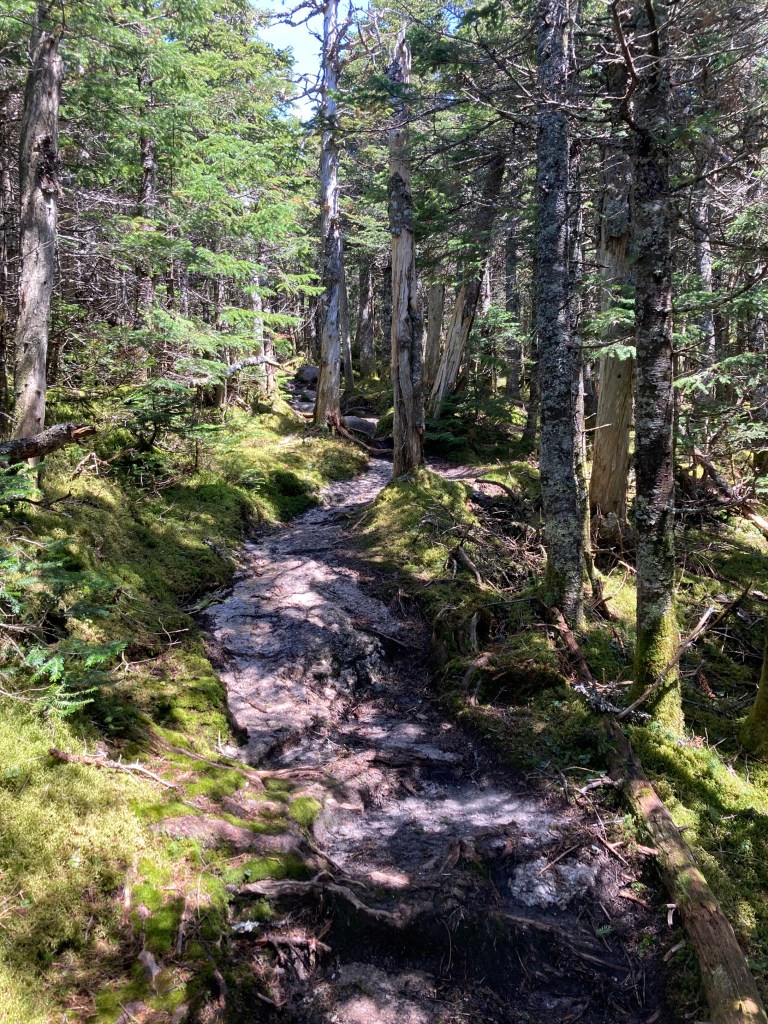 The down was much like the up, steep and slabby. Again the grit of the granite gave me confidence in my purchase, and I had no trouble getting back below the treeline. There, the relatively smooth trail resumed and carried me through the forest, over unknown hills and slopes. Green leaves hung above. Green leaves pushed skyward from below. Long-armed bushes filled the space in between with yet more green, completing the tunnel. I sped through, enjoying the presence of vibrant life all around me, occasionally sidestepping a toad or fallen tree. The wide, cloven footprints of moose remained squelched in the mud, and piles of scat were scattered everywhere, but I never saw what left them.