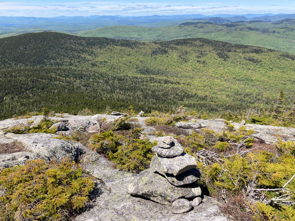 From the top, East Baldpate was a sight to behold, rising in a large dome of rounded granite, sparsely stubbled with short spruce trees. The layers of stone peeled and flaked like a croissant, but held firm rather than crumble into a jumbled pile of boulders like so many other rocky summits. However, as cool as Baldpate looked, it was everything else that truly caught my attention. The air was deliciously not humid, which felt fresh on my skin while also enabling the sharpest details of the surrounding landscape to reach my corneas. It was like a veil had been lifted. The greens of the forest had never looked so vibrant, nor the distant peaks so sharp. Maine was a vast sea of trees, with just a few lakes gleaming sapphire and several twirling wind turbines to break the beautiful monotony. It was all I could have asked for, and I was in love, excited to see what I might find across the horizon.