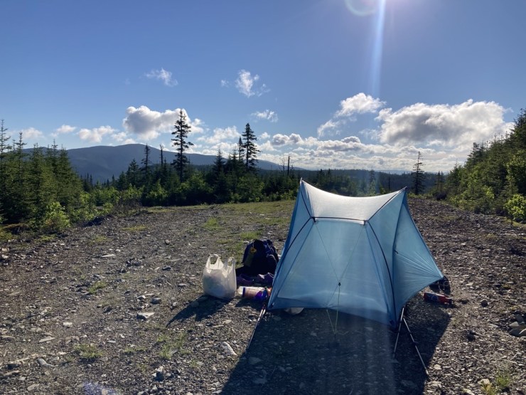 The alarm buzzed at 6am, and I snoozed it at 6am. I’d slept great, but Spice, not so much. Our tent, even though it was pitched tight as a drum, vibrated intermittently in the free-blowing wind all night long, breaking up her rest into an unsatisfactory pile of pieces rather than a solid, rejuvenating block. However, at this northern latitude in the height of summer, there was no denying the day. The sun was already hanging high in the sky, seemingly badgering us to get moving. C’mon, c’mon, let’s go. The day’s a-wasting. I was starting to worry about my dwindling food supply, so I poured myself a few meager handfuls of granola and got to it. We were packed and hiking by 7:30am.