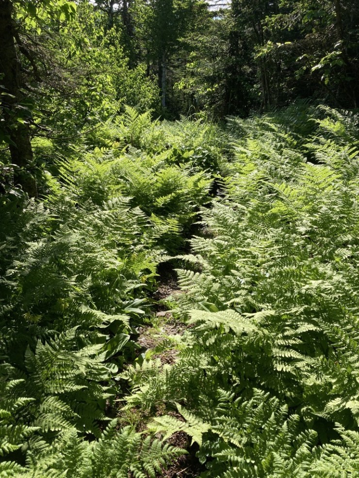 The trail was surprisingly smooth beyond the road, and the two of us hiked separately, lost in our own worlds of motion and contemplation. We followed the flat ridge on a winding path through sunny fields of ferns and white flowers. There were even some views over the tops of young trees. Forested mountains rolled to the horizon, and I wondered which ones we would have the pleasure of meeting. That big one ahead? Almost definitely. When Spice and I reconvened after a few miles, we were both singing the trail’s praises. That section had been down right magical. While not one element was a standout, all of it combined to create a stupendous soup of good vibes.
