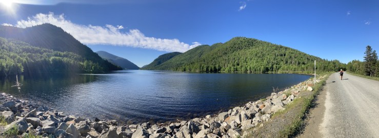 I dumped my trash and made use of the privy, then joined Spice to walk across the dam on the wide gravel road. The scene reminded me of similar moments during our hike on the Haute Route in the Alps, and that was a good sign. I find it really cool how steeply the mountains rise from an artificial lake, perhaps precisely because it looks intuitively unnatural. The long lake extended far into the distance, hemmed in by peaks of lush forest on all sides. It brought me peace to see such a large body of calm water.
