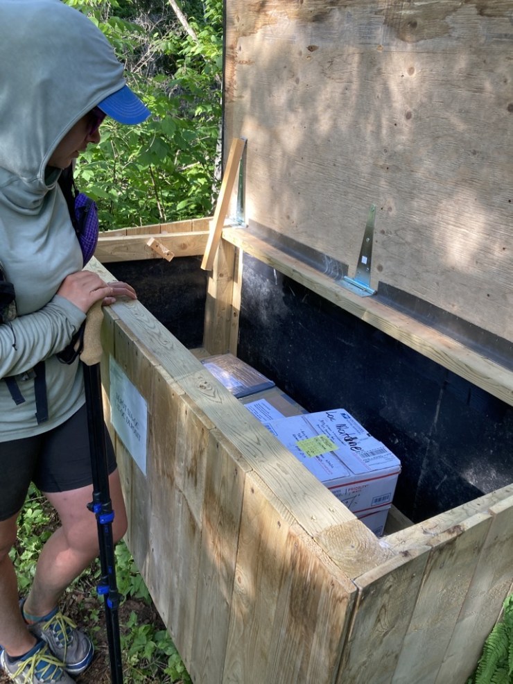 Unfortunately, that peace didn’t last for too long. When the trail turned off the road, we spotted the chest where the trail association delivers the resupply boxes of hikers who want to stay on trail rather than find their way into town. With the remoteness of this portion of the IAT, this is an awesome service that enables hikers to greatly reduce their food weight. Even though Spice and I hadn’t arranged for a box at this location, we opened the lid to check it out. We saw a big box with Roger’s name on it and, what? Hey, those are our boxes. Uh oh. It was a good thing that we did take a look, because sure enough, our resupply boxes were sitting in front of us, not where we thought they’d be at all. It was a day and a half too soon. What to do? Neither of us wanted to schlep that food over the next section of mountains, but could we risk leaving it here? Hopefully, we could arrange for our food to be moved to the proper location in time for our arrival, but at worst, if we left it here, we could hitchhike back to collect it.