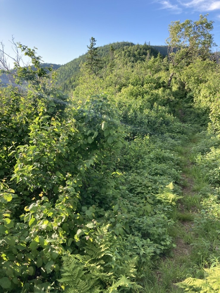 That quick fix obliterated my stress and lifted our mood for the rest of the evening. Now that the issue was resolved, it left me feeling deliciously excited and alive. Isn’t this fun, wooooooo. And the trail helped us keep a good thing going, even though it was pretty much all uphill until camp. It wriggled up the spine of a ridge, cutting a green hallway through dense growth that seemed to be one continuous bush. It was a fun ride as we climbed into the clear sky, with views expanding all around us.