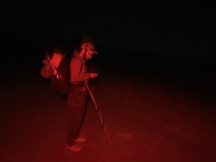 Nothing much had changed in the seven hours since we made camp. The strange orange point of light still burned with strength across the valley, and the breeze still caressed warmly, flowing around us like a river over stones, from darkness to darkness. The strongest indicators that time had passed were the bright points of the Big Dipper. When we went to bed, they had been diving below the horizon. Now they were climbing high once again, endlessly twirling around Polaris. Or were we the ones twirling? The moon had also trekked high into the sky, and now reflected enough cool light to see by. We packed up, pooped, and ate by the red light of our headlamps, but turned them off once we shouldered our packs and resumed our dark traverse of the Panamint Valley.