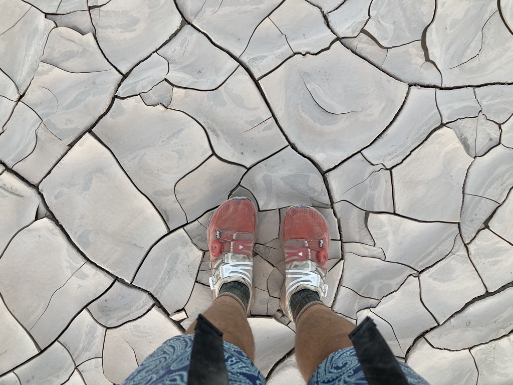 The sky dusted orange just as we turned left off what was now just a few tire tracks disappearing into the distance. Pointing to a hulk of basalt, we set out across the trackless playa, a pale yellow flat of cracked mud. The air was noticeably cooler here for some reason. Not just cooler, actually, but legitimately cool. It was a welcome splash before the sun roasted this bone.