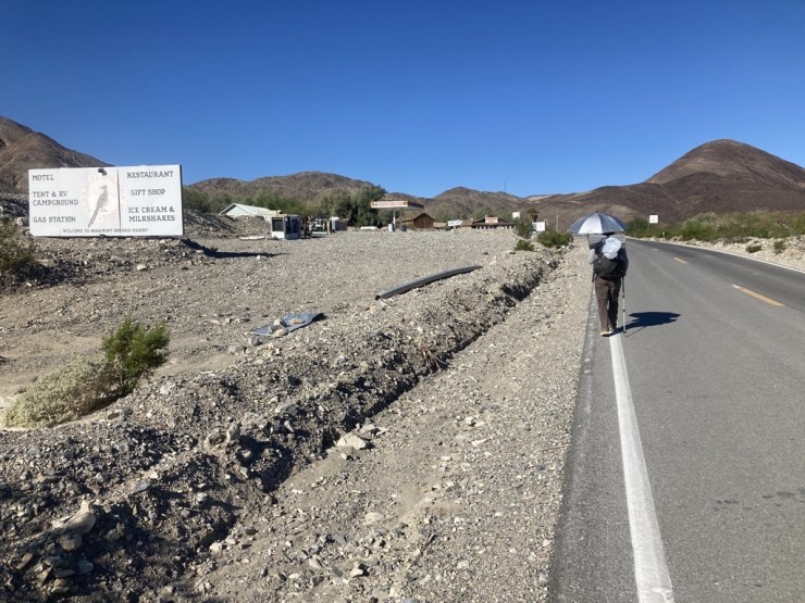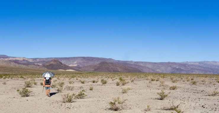 An hour later, we were across the playa and across Panamint Valley Road. Popping open our umbrellas, we soon ditched another dirt road to take the shortest route to Panamint Springs Resort, where waited our resupply box and the promise of relaxation. Our basalt hulk was useless to us now, and instead we aimed for a pair of diminutive white lumps.
