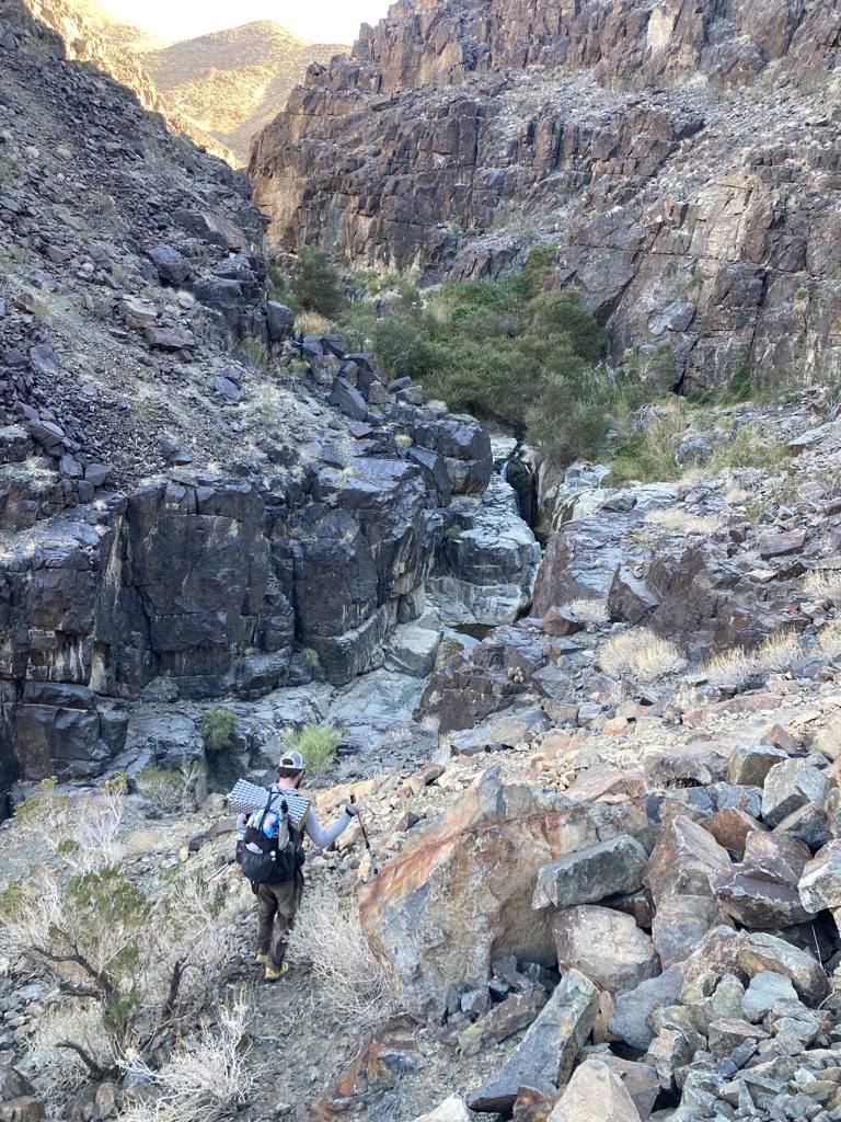Now we walked up a wide wash with gully and ripples in the gravel that told the story of violent floods and impermanence. Conversation related to our relief that we’d made it through with satisfyingly few reroutes and the shocking difference between expectations and reality. Darwin Canyon kicked our butts, but in the best way.