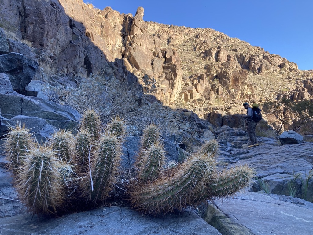 The fun continued for longer than we had expected, and we eventually emerged into the shallower, wider Darwin Canyon after a long contour above the water on a crumbly slope of rock and cactus. Our old friends, the wild burros, had carved a smooth track that we followed safely back down to the bottom of the canyon, which now showed no signs of consistently flowing water.