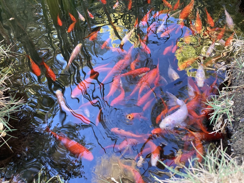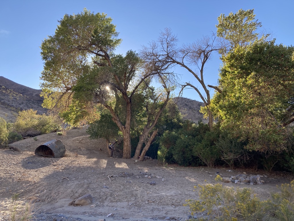 A tired cruise soon delivered us to our home for the evening. China Garden Spring was located at a confluence of two washes and marked by a towering stand of cottonwoods and a disappointing amount of historic human garbage. Eagerly we hunted around the dense greenery for the water, finding it next to a busted metal tub, rusting and perforated with hundreds of bullet holes. However, debris aside, there was magic in the water. Streaks of orange and white danced below the surface. Hungry mouths gulped the air, wanting more. Somehow, some way, there were goldfish in China Garden Spring, and they seemed happy to see us.