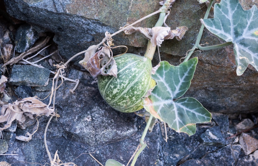 Then it was up a steep scree slope (right of water) that I did recognize from the internet. Whew, what a relief. We spent a few minutes being confused by what we would come to know as mini, watermelon-like buffalo gourds, then cut left above a black cliff to carefully contour deeper into the upper gorge.