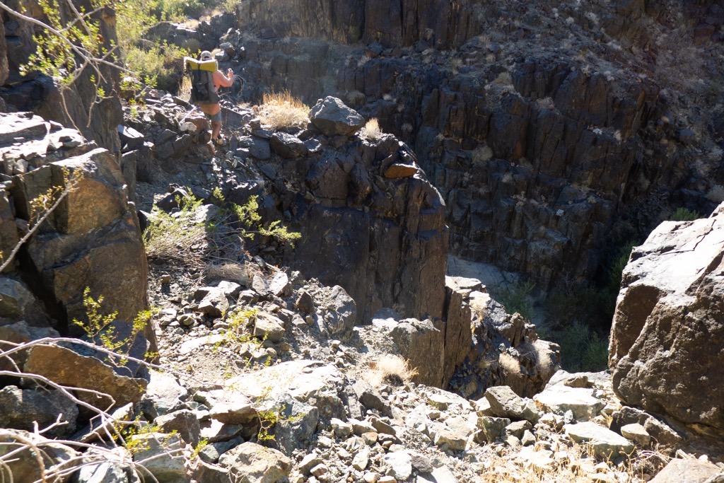 I hadn’t thought that we would need to descend back to, then cross the river above the falls because I hadn’t seen a picture of it before, but sure enough, this got us where we needed to go. The precarious scramble was made slick by a thin layer of dust on water-worn stone, but with good holds we both made it safely down and across.
