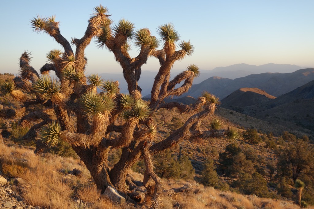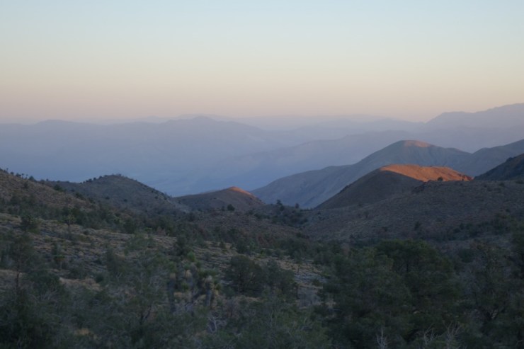 We hiked by moonlight into the gradual embrace of the Inyo Mountains. Joshua trees were replaced with sagebrush, which was soon followed by piñon pine. The breeze stilled as the mountain folds constricted around us, and the only sound came from our crunching steps, clicking poles, and quiet conversation. The sky lightened and I warmed up, feeling the chill of my sweat every time I arched my back to expose my damp shirt. We passed the turnoff to the bitchin’ Permian fossils in a forested canyon, then clambered out of the wash to follow the road over and out of this particular fold of fuzzy hills.