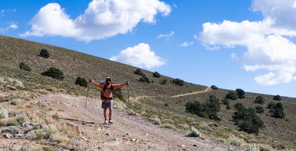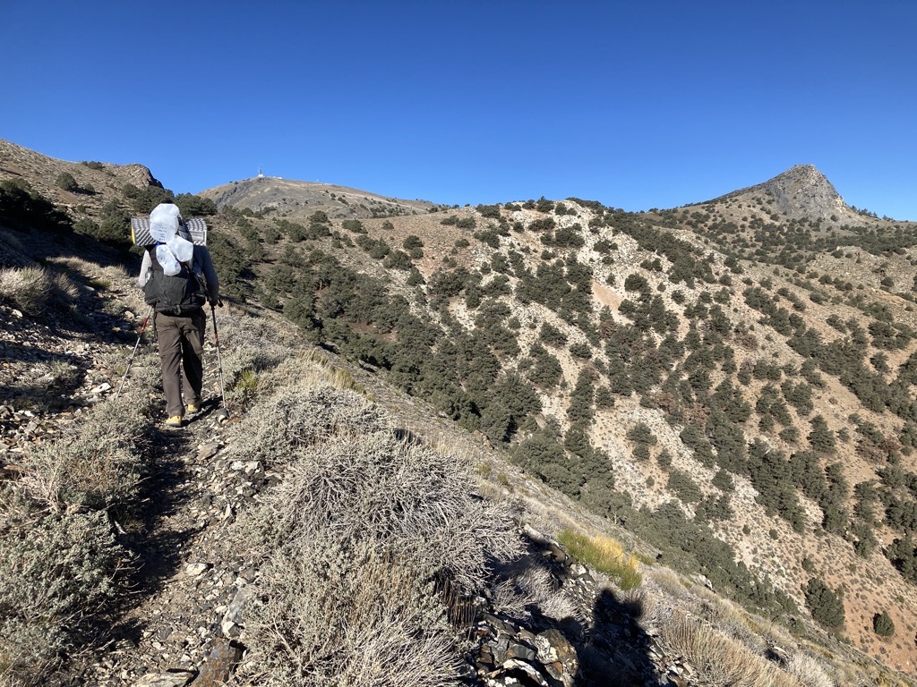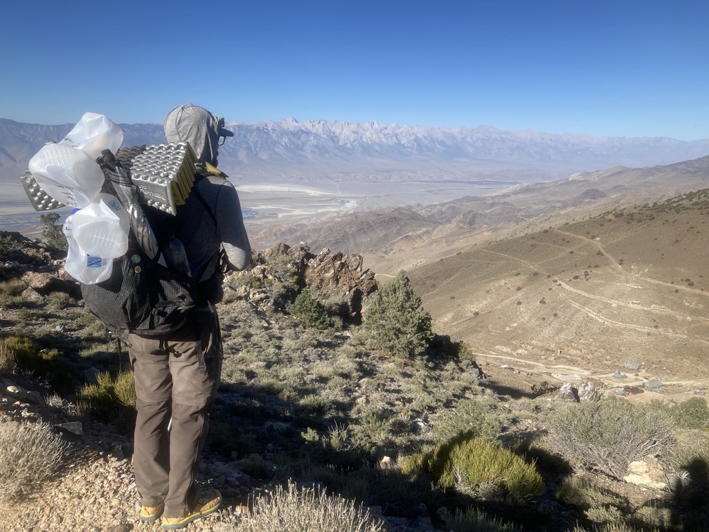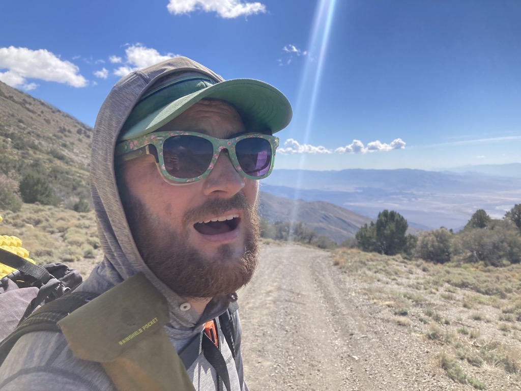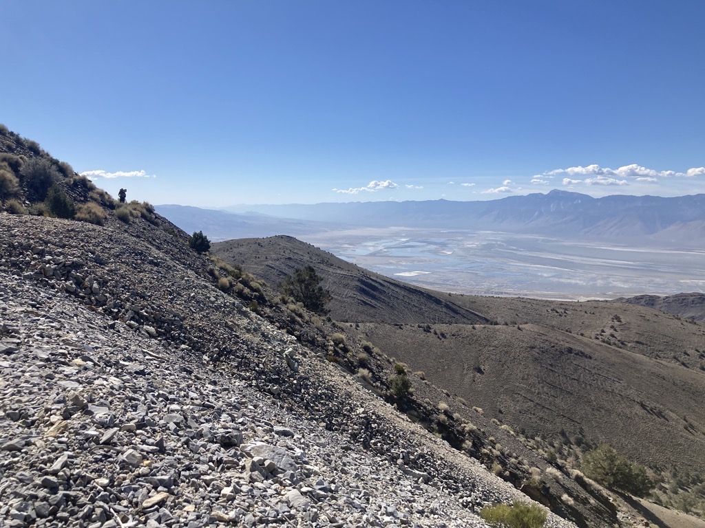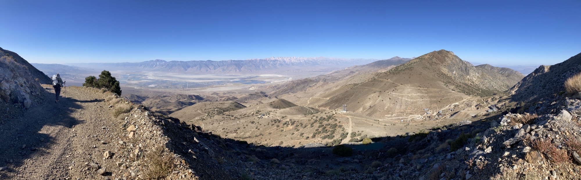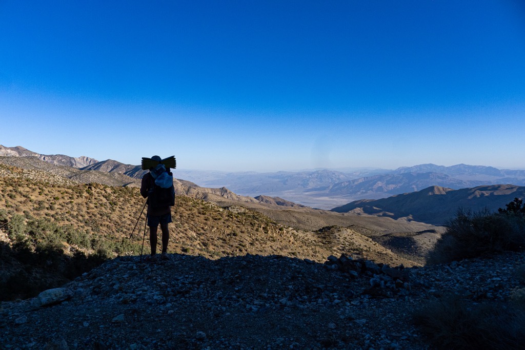 The road above Belmont Mine had degraded to a single track across a steep slope of talus. But did that stop us humans from having a good time out here? Nope. While steep, it was still smooth hiking. I chugged along behind Arthur, settling into a strenuous yet sustainable pace as we finished the final twists to the top. There, we broke into the sunshine at a small and airy saddle with tremendous views across the tapering tail of the Inyo, Darwin Flat, and Panamint Valley, all the way to Telescope Peak. It floated dark on the horizon on a cushion of haze that matched the sky and was a satisfying reward for our efforts. It also offered another moment for reflection. This is awesome. The L2H rules.