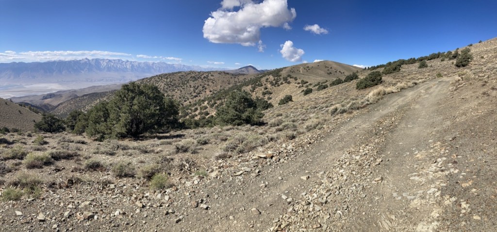 The major climb of the day was pretty much done. Now it was time to enjoy the ride along the crest of the Inyo Mountains. The old road contoured past a point of striking gray stone, then into a high confluence of two saddles, a secret kingdom of sage hidden from the world. After one more little ramp, we were looking way way down to the next, and final valley of our journey.