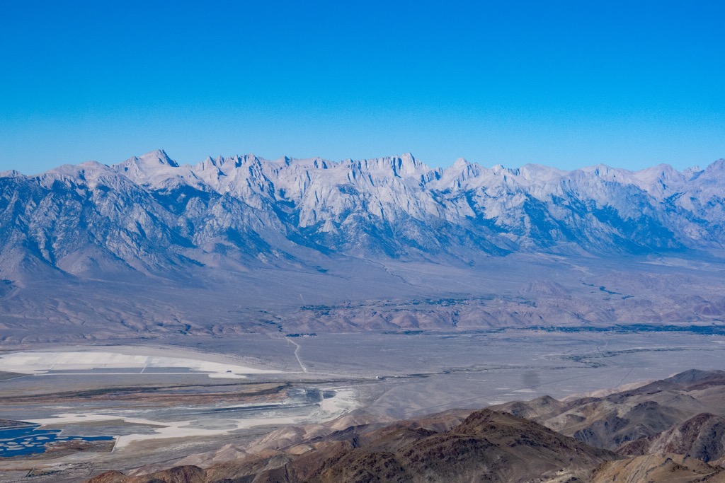 The Owens Valley is my favorite place in the world for many reasons, but this view would have won me over even if I had never seen it before. It was arresting. I stopped and could not walk, I had to look. For it was not just the valley, but also the escarpment of pure Sierra granite rising to a serrated edge on the far side. The points and jagged cuts were known to me, bringing back a flood of memories as I traced the horizon from Olancha to Cirque, over Langley, Mallory, Irvine, and Muir, rising up the Needles to the big one, Whitney (Tumanguya), and beyond to Russell and Williamson. This was the best view of the best mountains, and I was so grateful to be here.