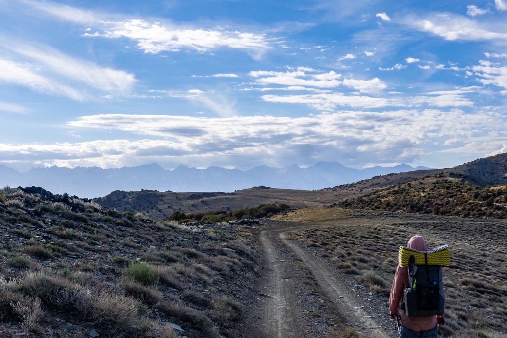 However, we quickly let the indignity disperse as the road turned gradual for a long flight along the endless crest of the Inyo. Riding the mild undulations and flip-flopping across the sage-covered ridgeline was hiking of the highest quality. The air was cool and the sun hot. The views in all directions were epic. Our road was visible for miles ahead, the Saline Valley baked 8,000ft below to the east, and the Sierra did their thing to the west. No time to complain about the heavy water on our backs. We couldn’t be here without it.