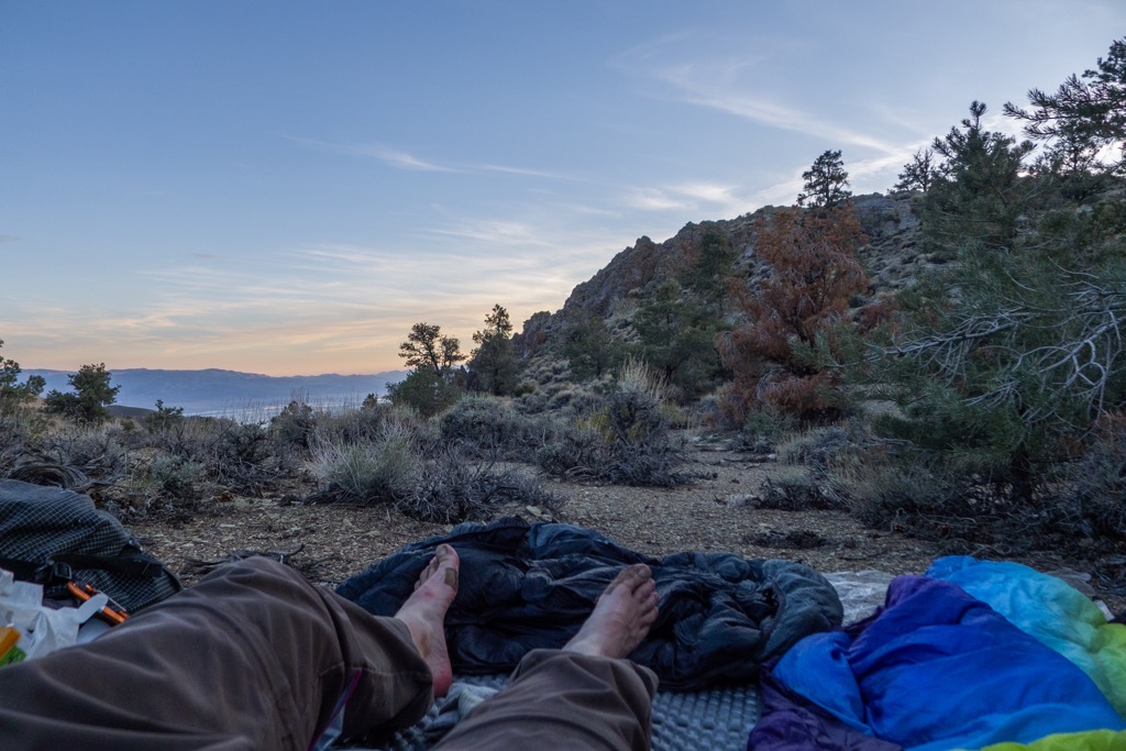 My well-used quilt was just not cutting it anymore. After 70 nights on the AT and IAT, the accumulation of my filth had rendered the synthetic insulation clumpy and impossible to distribute evenly. The night had been our coldest so far by a significant margin, but it was still significantly warmer than my quilt’s 30°F rating. I’d slept through most of the night, mostly comfortable, but the dead spots absent of insulation left the door open for a chill to take over my feet and thighs. The desert gets cold at night, especially above 5,000ft. Arthur and I slept at 6,100ft, and would be higher still tonight. No more messing around. I’d learned my lesson and would put on all of my bonus layers before lying down again.