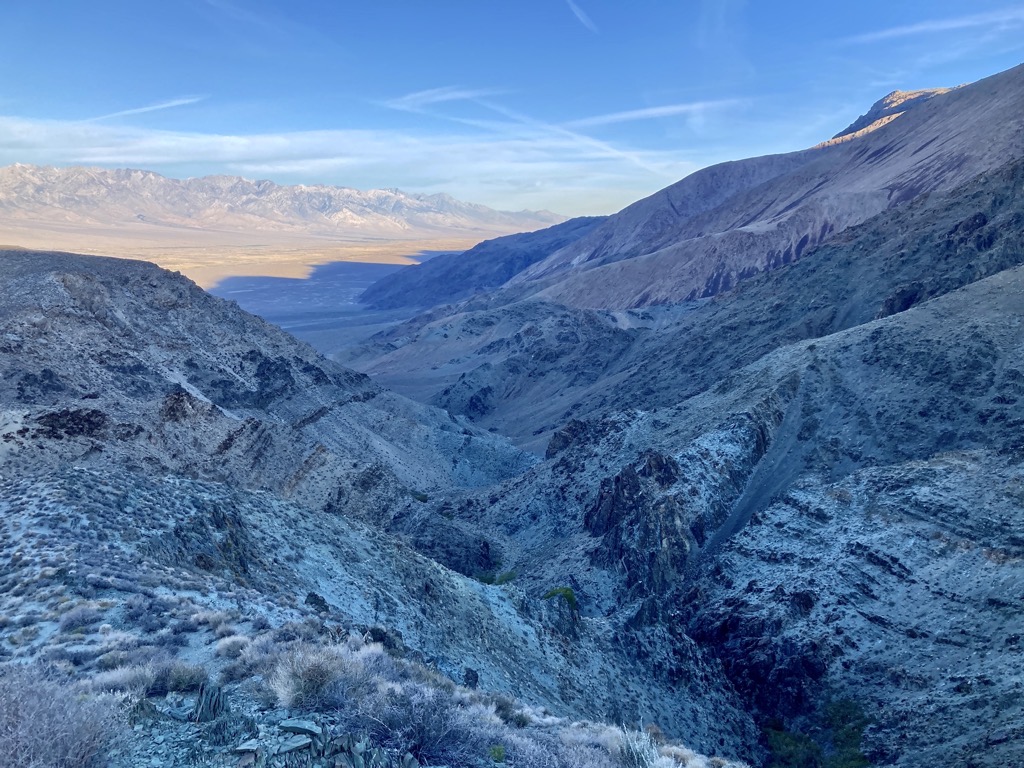 In just a few minutes we were soaring again, surrounded by more air than solid ground. The immense shadow that the Inyo Mountains cast across the Owens Valley was a dead giveaway of their bulk, and thinking that we were wrapped up in it helped the bottom feel very far away indeed. We were flies on a wall, but wait, we couldn’t fly. So really we were ants on a wall. A really tall wall made of sand and crumbly rock covered in brittle bushes.