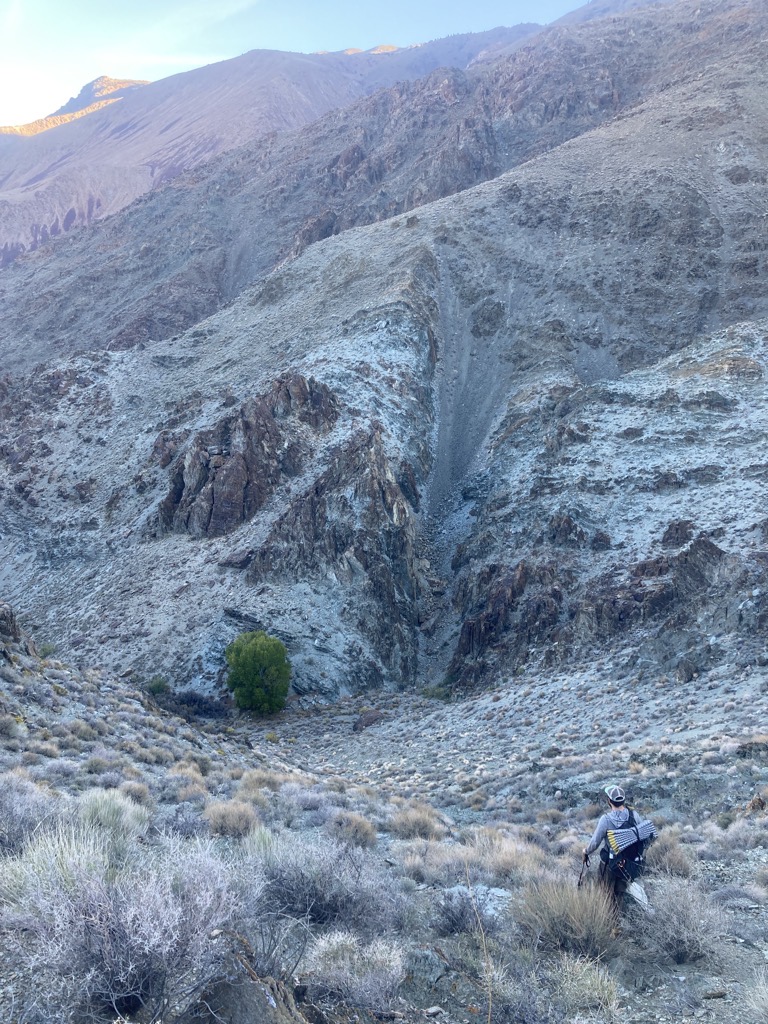 As we wiggled along a narrow wash of a tributary, the hills drew back like a curtain to reveal the eastern slope of the Sierra in all its sunrise glory. From tip to base, the accommodating canvas of pale granite reflected an unearthly warmth of electric cherry that sizzled above the hazy twilight of the valley floor. Shadows and light slow-danced, accentuating the depth of the mountains in clashing stripes and puddles. After yesterday’s consistently marvelous views, I wasn’t surprised to be surprised yet again, thanking Arthur, and my legs, for getting me out here.