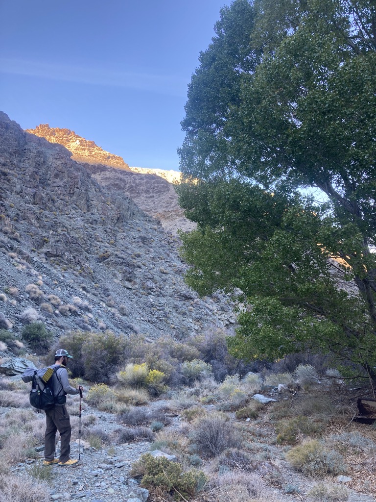 The great tree was a wonder. The bushy limbs were the greenest things we’d seen in days, since leaving the vibrant overgrowth of China Garden Spring. But there was no spring here, just a few scraps of unidentifiable rust amidst the muted earth tones that screamed “dry!” with a unified voice. We sat under the tree even though it wouldn’t cast any shade for another hour after the sun finally climbed high enough to penetrate these mountain depths. As fellow water-loving creatures, it felt right to say hello, if just for a few minutes while I emptied the gravel from my shoes.