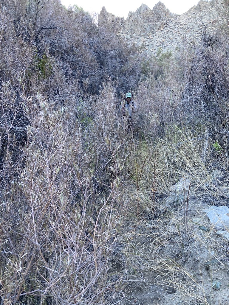 The trail faded away completely at the steepest section, so Arthur and I split to find our own paths to the bottom. Aiming for the obvious cottonwood at the bottom, Arthur took the direct line over some bigger slabs, while I weaved across the soft stuff, hunting for the elusive use-trail that was all but guaranteed to be there. I found it after a few slips, and zig-zagged down to the beautiful solidarity of flat ground.