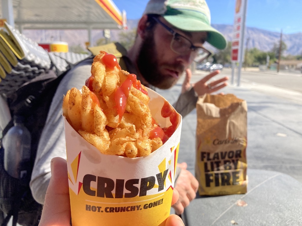 Then a dream came true. Sure, it wasn’t a couch, but Carl’s Jr. had not just fries, but criss-cross fries. Arthur went a different direction, ordering onion rings and jalepeño poppers. We slathered sauce over our bounties before striking out to strut our stuff down the main drag. Yeah, we hiked here from Death Valley. Yeah, like, we walked, all the way. We were hot shit, and we knew it.